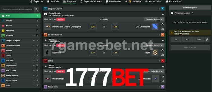 O 1777Bet oferece uma grande seleção de opções de apostas em e-sports com probabilidades competitivas